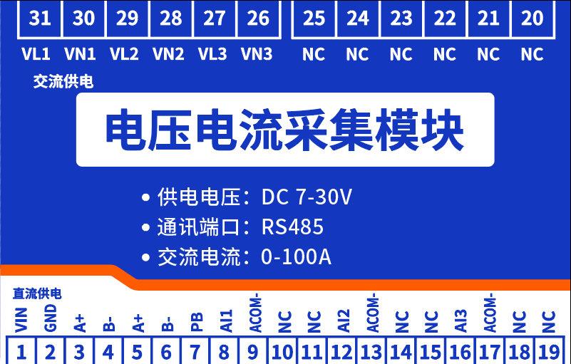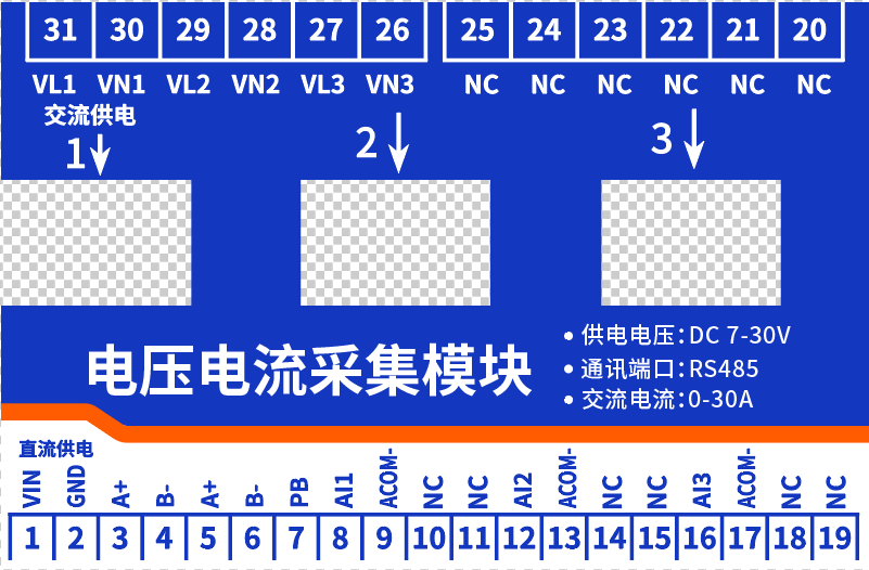 交流電壓采集接線口 | 31 | 電壓1 | VL1火線或相線,VN1為零線 |