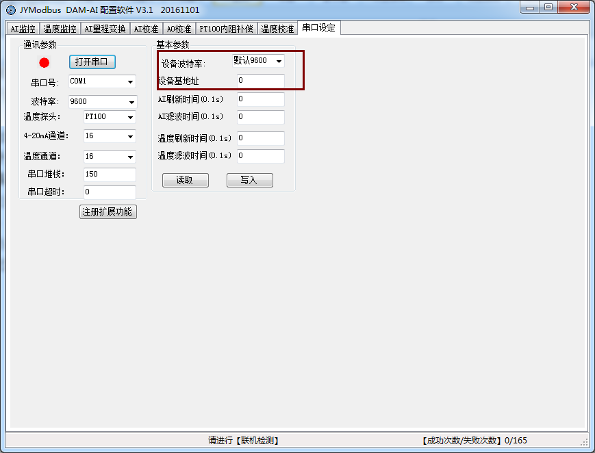 打開采集配置軟件,選擇串口設定菜單,在通訊參數(shù)中點擊關閉串口,選擇相應的串口號和波特率(默認9600),超時時間和最小間隔都改成50ms。基本參數(shù)中設備型號選擇PT08。點擊打開串口 ,點擊 讀取 按鈕,在下邊信息欄中顯示讀取成功,則表示聯(lián)機成功,(若顯示通信失敗,請確定串口接線,串口號,波特率和地址是否正確)。