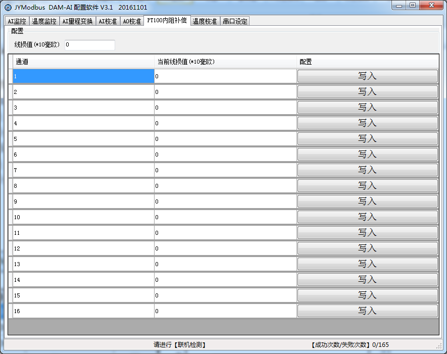 反之實(shí)際溫度是20.1度,第一路顯示溫度是20度,說溫度低了0.1度,對應(yīng)PT100電阻是38毫歐,在線損值輸入框填入-3.8,點(diǎn)擊第一路后邊的