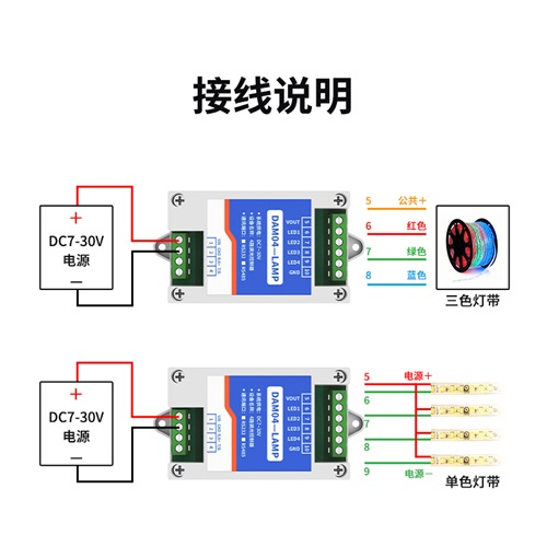 DAM04-LAMP是一款專用的4路調光模塊,采用MOS管形式進行輸出不同占空比的周期信號以實現(xiàn)電壓的調節(jié),可實現(xiàn)調光、調壓、調速功能。上位機可使用485通訊進行控制設備,實現(xiàn)家居燈光明暗、顏色變化等功能。