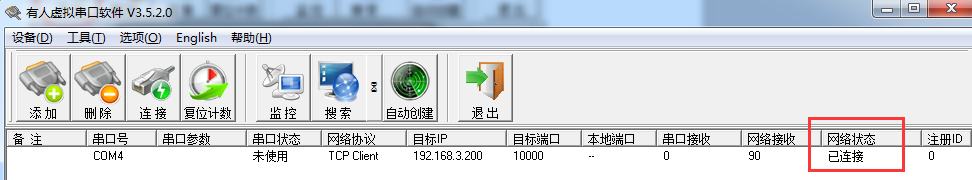 虛擬串口添加完成后,建立的虛擬串口狀態為已連接狀態,如下所示:
