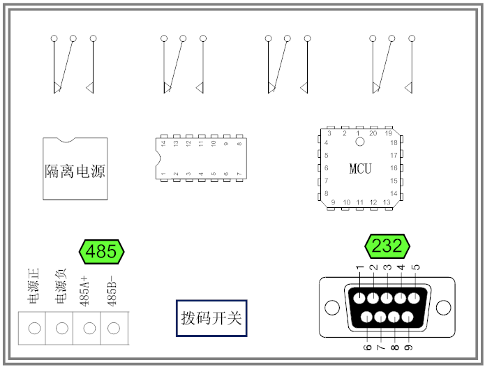 應(yīng)用舉例及其說明:本機(jī)地址除了偏移地址地址之外,還有默認(rèn)的254為廣播地址。當(dāng)總線上只有一個(gè)設(shè)備時(shí),無需關(guān)心撥碼開關(guān)地址,直接使用254地址即可,當(dāng)總線上有多個(gè)設(shè)備時(shí)通過撥碼開關(guān)選擇為不同地址,發(fā)送控制指令時(shí)通過地址區(qū)別。
