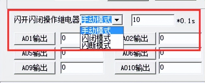 打開“聚英翱翔DAM調(diào)試軟件”點(diǎn)擊繼電器模式后面下拉箭頭進(jìn)行模式的選擇。(后邊時(shí)間可自行設(shè)置,實(shí)際時(shí)間=填寫數(shù)字*0.1【單位秒】)
