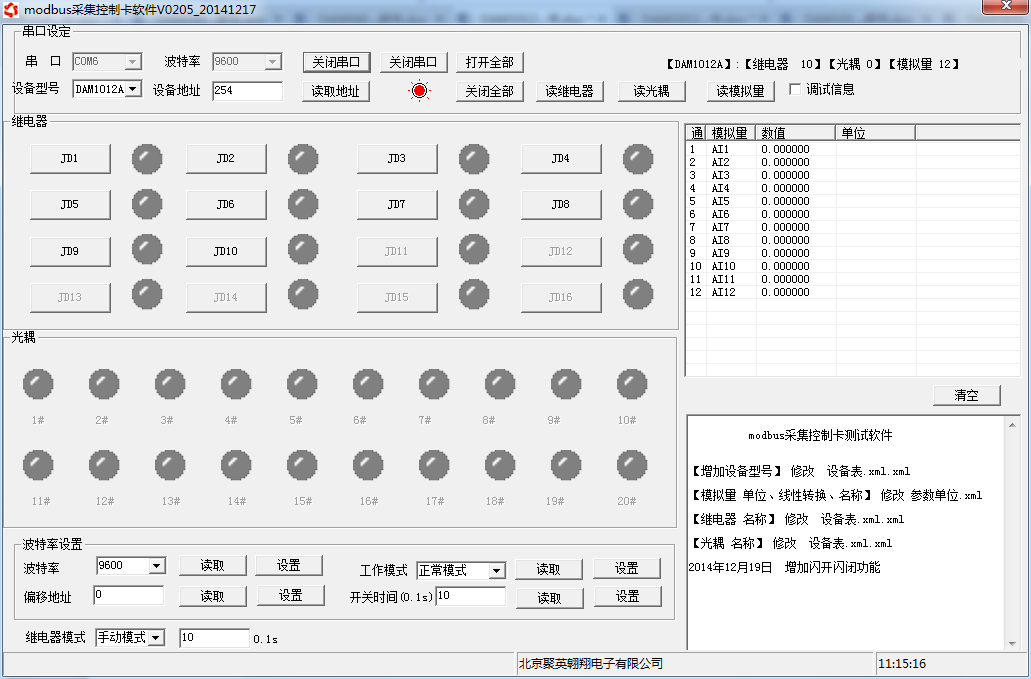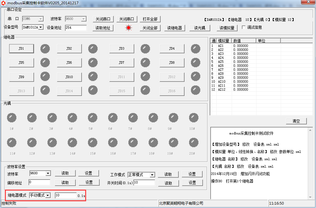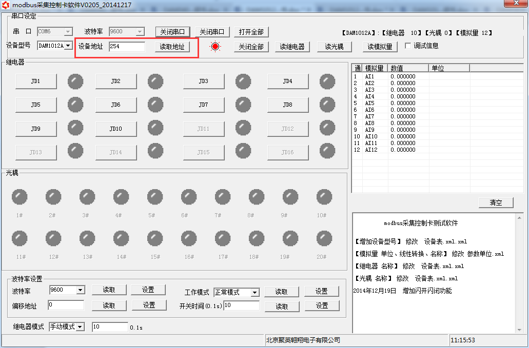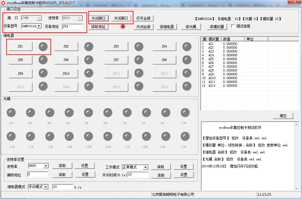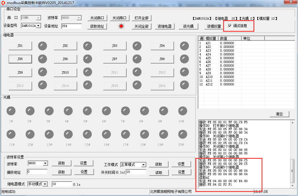打開“聚英翱翔DAM調(diào)試軟件”;串口設(shè)定欄:串口選擇您電腦對(duì)應(yīng)COM口,波特率選擇設(shè)備默認(rèn)波特率(9600)(未自己設(shè)置過波特率前),設(shè)備地址填寫“254”(254為設(shè)備的廣播地址),設(shè)備型號(hào)選擇相對(duì)應(yīng)型號(hào),設(shè)置好以上設(shè)備的4個(gè)參數(shù)后點(diǎn)擊打開串口,點(diǎn)擊繼電器按鈕“JD1”若繼電器反應(yīng)則連接成功。