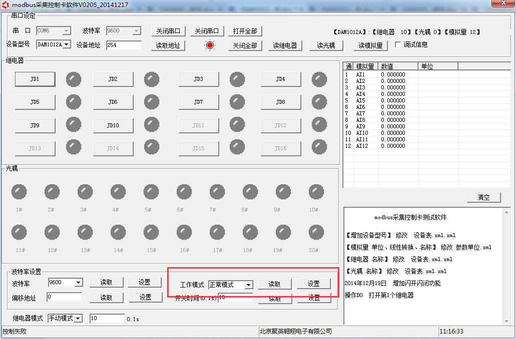 打開“聚英翱翔DAM調(diào)試軟件” 點(diǎn)擊下方工作模式設(shè)置欄的“讀取”和“設(shè)置”就可以分別讀取和設(shè)置工作模式。