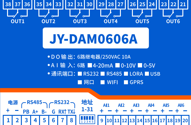 6路繼電器控制(DO)6路開關量采集(AI) DAM0606A 工業(yè)級繼電器控制板 ,6路繼電器控制輸出,觸點隔離;6路模擬量(4-20ma、0-5V、0-10V)輸入;支持RS232或隔離RS485通訊接口;標準Modbus協(xié)議,支持Modbus RTU/A...